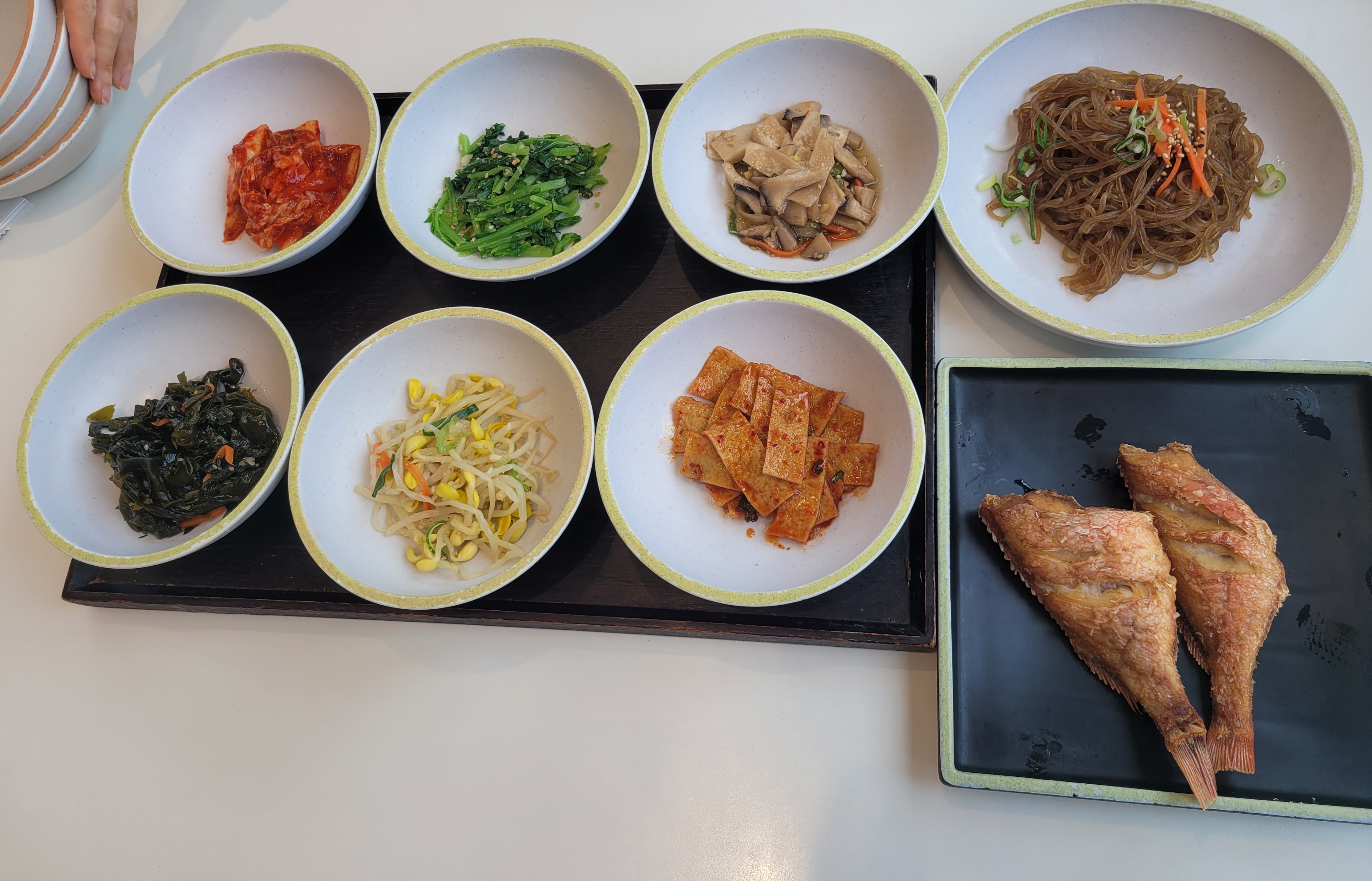 김치, 이름 모를 나물, 버섯볶음, 미역무침, 콩나물, 오뎅볶음, 잡채, 생선구이