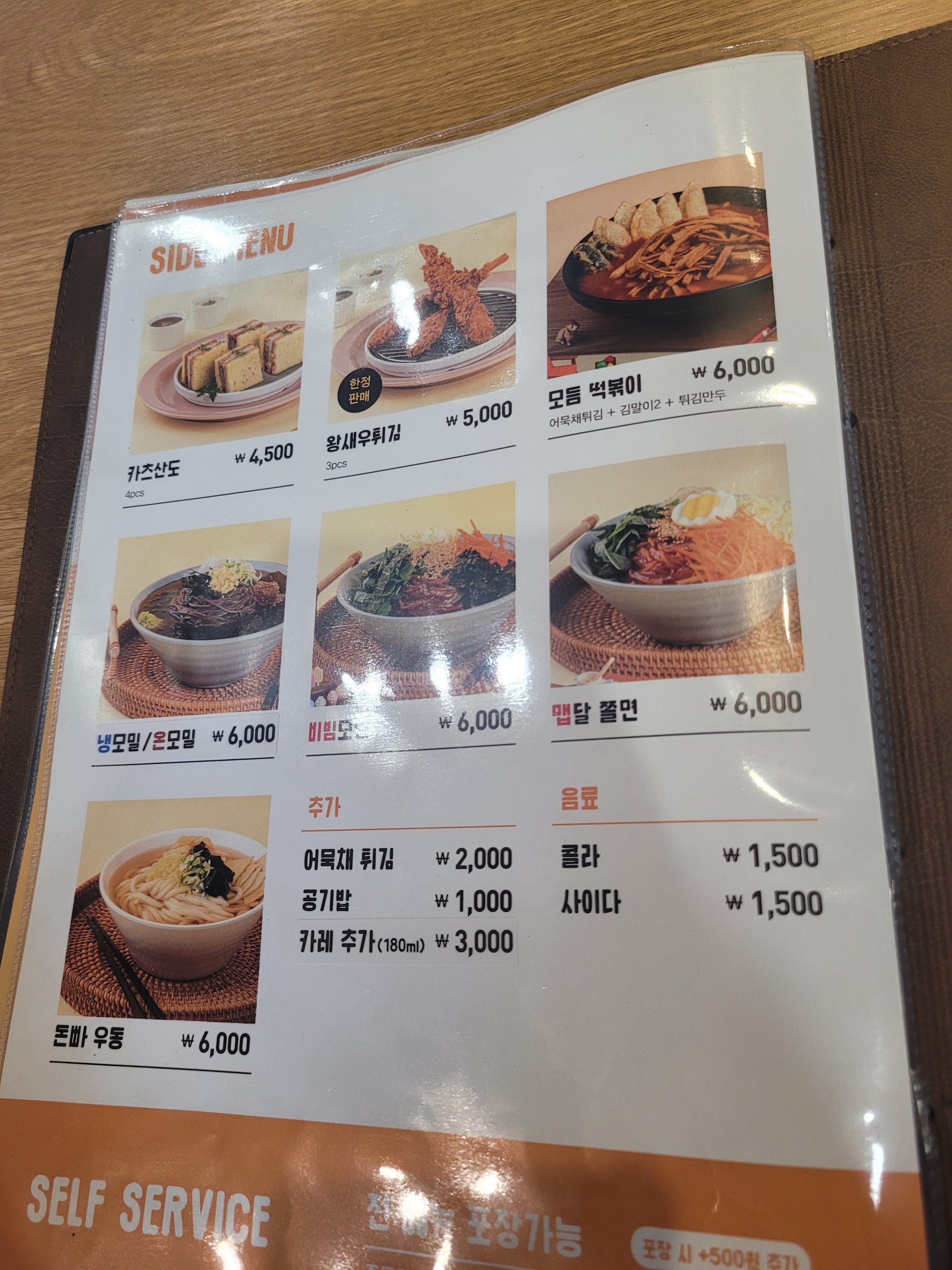 면은 냉모밀, 비빔모밀, 우동, 쫄면 중에 고를 수 있습니다.