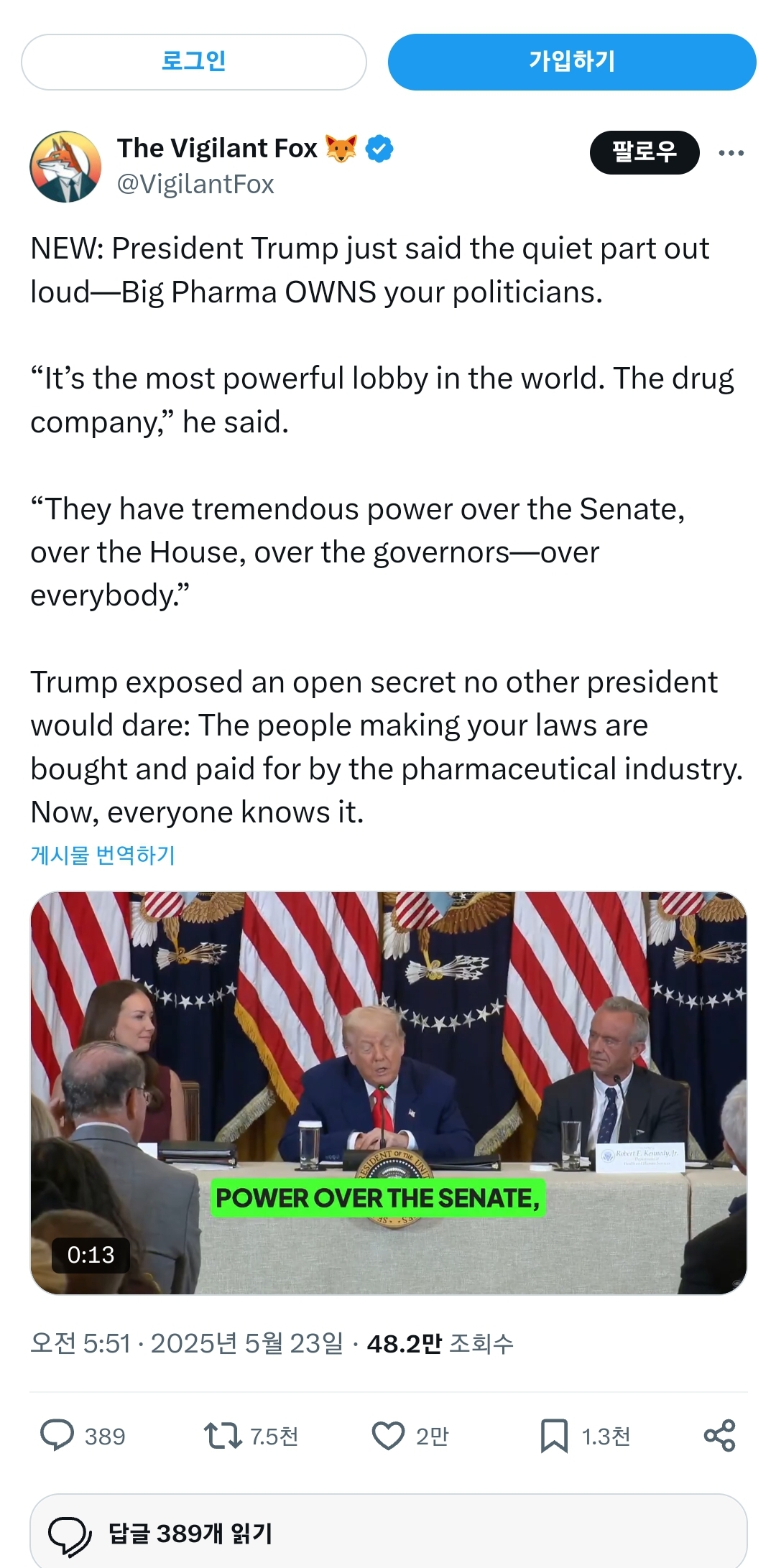 트럼프는 다른 어떤 대통령도 감히 말하지 못했던 공개된 비밀을 폭로했습니다: 당신의 법을 만드는 사람들은 제약 산업에 의해 돈을 받고 움직입니다. 이제 모두가 그것을 알게 되었습니다.