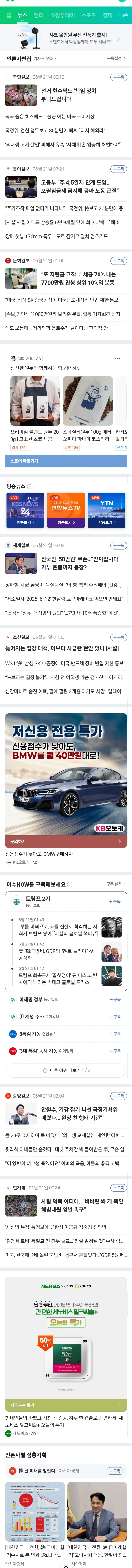 아래는 방금 전 네이버 뉴스 메인